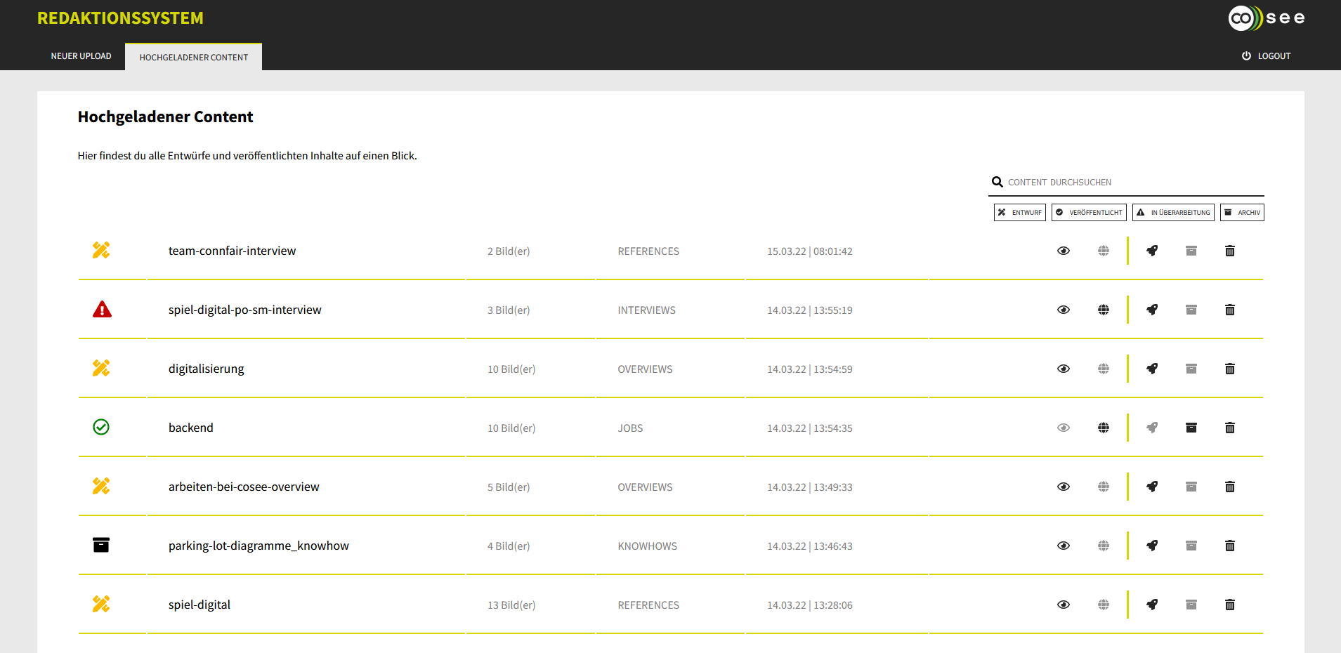 kann hier erkennen, ob der Content noch im Entwurf ist, bereits veröffentlich wurde oder sogar schon wieder offline